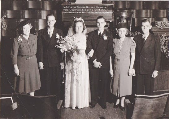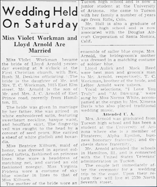 This isn’t exactly a Sunday Sermonette, but I want to write about this event today. I mean, it happened in a church, so it kind of counts. On Saturday, December 28, 1940, my parents were married in Tucson, Arizona. This article from the society page of the Arizona Daily Star provides all of the details about the 8:00 pm wedding at the First Christian Church in Tucson. I don’t recognize the names of the women who were my mother’s attendants, but I do recognize the names of my father’s groomsmen. The best man was Lloyd Aulick, whose name I recognize as one of the men my mother dated before she settled on Lloyd Arnold. My mom told me at one point that her parents were happy that she had chosen the “right” Lloyd. The ushers were my mother’s 11-year-old brother, T.C. Workman, and my father’s 12-year-old brother, LeRoy “Lee” Arnold. My mother’s younger sister, Mary, told me many years later that my mom asked her to be a junior bridesmaid, but Mary turned her down because she didn’t want to wear a fancy dress. Mary said that she regretted turning down this opportunity, but she was a kid and thought she knew what she wanted.