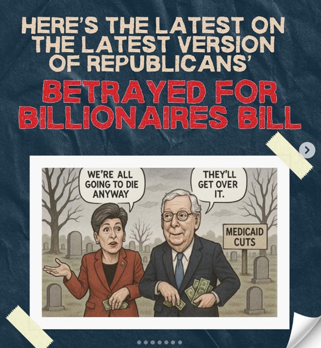 I’m no longer leading the Indivisible Group, but I still get regular emails from the group’s leader, Luisa. Earlier today, I received an email about the group’s response to the Senate’s passage of the Republican reconciliation bill. She provides good information about the bill, and is also asking people to participate in phonebanking tonight to tell people about the imopact of this terrible bill.