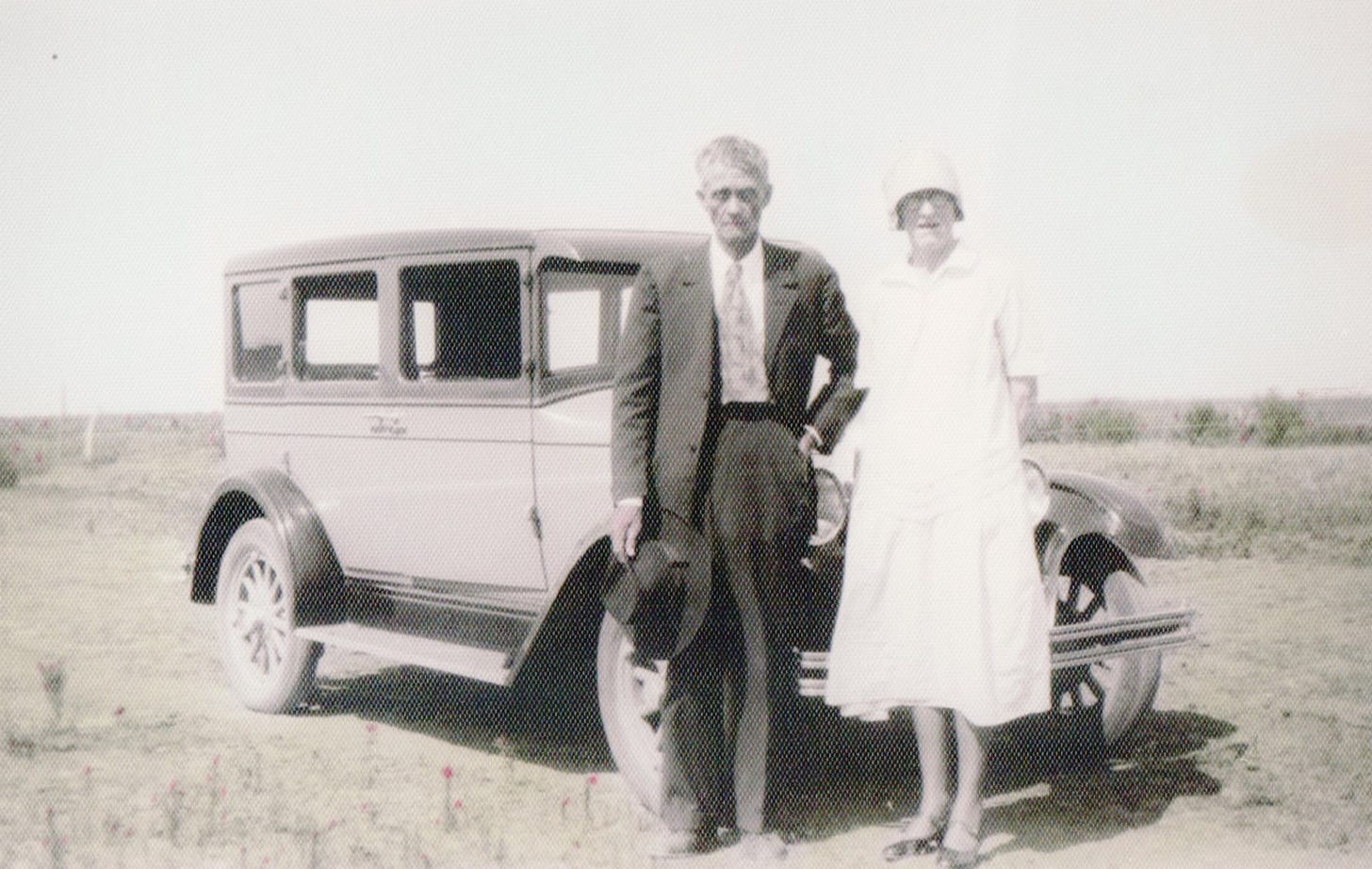 Clothing and Car Style: The attire of both individuals, along with the style of the car, suggests that this photo was taken in the late 1920s or early 1930s. The woman's dress and hat are indicative of the flapper style popular in the 1920s, while the man's suit is also characteristic of that era.