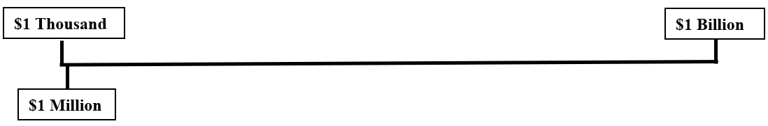 Their other errors have confused millions with billions. I recently read about an experiment done to assess people’s understanding of large numbers. In this experiment, people were asked to construct a line that had $1 thousand on one end and $1 billion on the other end. Then they were asked to place a mark at the $1 million mark; most people put the $1 million mark somewhere around halfway between $1 thousand and 1 billion mark. In reality, this is what that line would look like:
