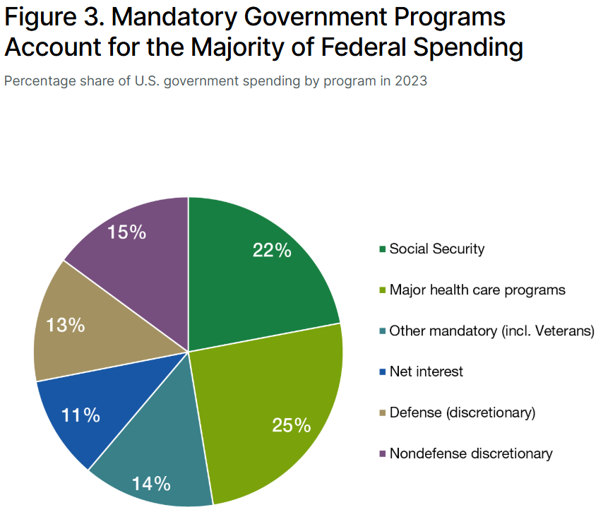 One toss-off comment he makes occasionally when talking about the federal budget is that “the United States is an insurance company with an Army.” What he means by this is that the bulk of federal spending (@75%) goes to Social Security, Healthcare, other mandatory spending including Veterans, and National Defense. We’re all familiar with charts that look like this that support his point.
