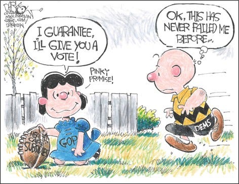 The tragedy isn’t that Charlie Brown keeps believing. It’s that the system only works if most people act like Charlie Brown, and it collapses when too many people decide to act like Lucy.