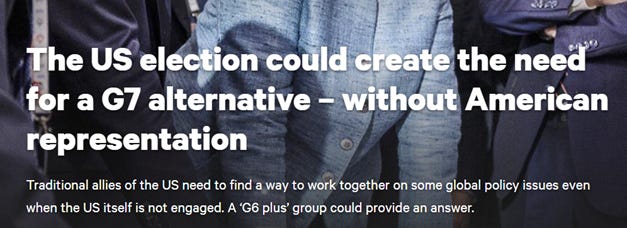 While Americans of every stripe are clutching their pearls and wringing their hands about the possible results of next month’s presidential election, the G7 (an informal grouping of seven of the world’s strongest economies – Canada, France, Germany, Italy, Japan, the United Kingdom, and the United States, as well as the European Union) is trying to figure how to work together on global policy issues even when the US itself is not engaged.