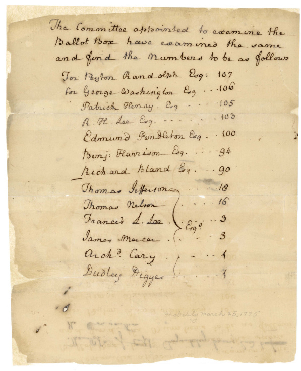 At this meeting, the delegates chose four men to represent them in Philadelphia – Peyton Randolph, Richard Henry Lee, George Washington, Patrick Henry, Richard Bland, Benjamin Harrison, and Edmund Pendleton.