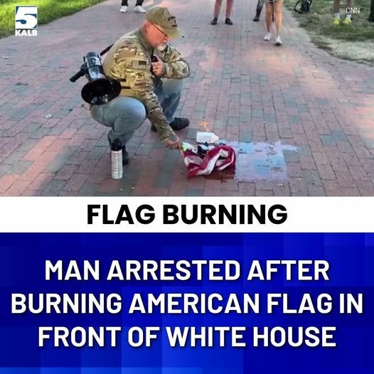 UPDATE: As was totally predictable, someone burned an American flag outside of the White House this morning in protest of the current Republican president’s illegal order. The fact that the offender was a 20-year combat veteran is the icing on the cake. And, again predictably, he was charged with lighting a fire on federal property, because there are no laws against burning the flag. No, not even when the dictator wannabe in the White House issues an order.