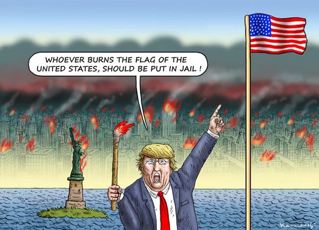 This week, the current Republican President -- who clearly doesn’t understand any of this -- issued an executive order overturning this Supreme Court precedent. Never mind that he doesn’t actually have the power to do this – he does things like this anyway. He issued an executive order laying out a plan to prosecute people who burn the flag. He has no power to enforce this, of course. And flag-burning is not an epidemic. In the 1980s, more flags were burned to protest the Texas ruling (before it went to the Supreme Court) than had been burned in any other type of protest.