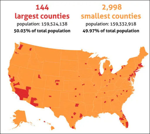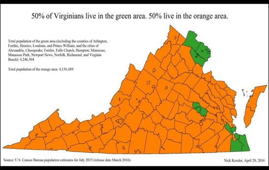 In Virginia, half the population lives in the green areas on the map. These are urban and suburban counties that vote for Democrats. This map is eight years old, but the trend it illustrates is unchanging. These areas are also the fastest growing areas in the state; people are leaving the orange areas to move to the green areas, and people who move to Virginia from other parts of the country or from other countries are much more likely to move to the green areas. The green areas are increasing, not only in relative population but also in political clout.