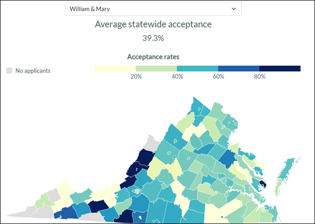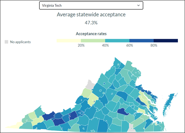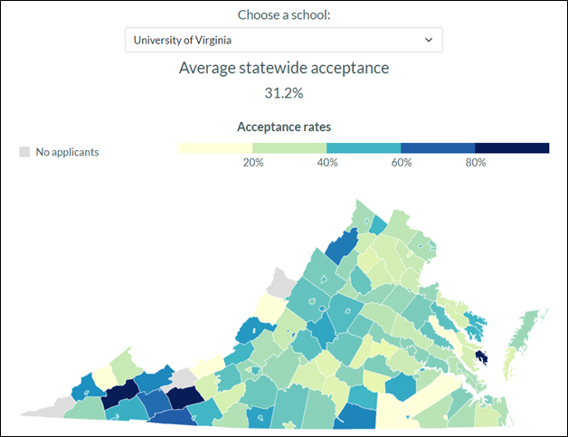 The high admission rates in the westernmost and rural parts of the state provide a clue, I think. As a state university, UVA is under some pressure to admit students from across the state. The law of small numbers plays a role, I think. When I clicked on the map on the website, I saw that in Russell County (the black state furthest west) 100% of the students who applied were admitted – one student applied and he/she was admitted. In Fairfax County, 4,302 students applied to UVA, and 1,272 were admitted – 29.6%. You can click around this map on the website and see if you figure out what these admission rates mean – if anything.