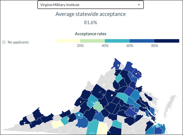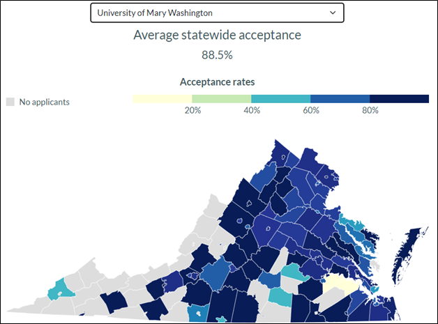 The Virginia Public Access Project (VPAP) is a daily online news source about all things Virginia. In today’s edition, they published a graphic showing the varying rates of college acceptance across Virginia. I thought it was interesting and I wanted to show it to you.