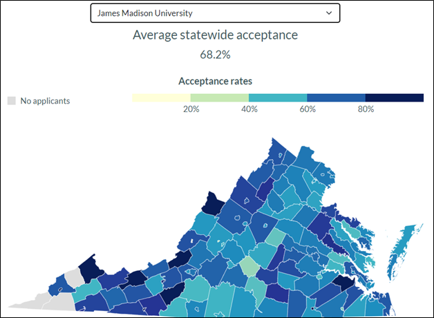 The graphic shows Virginia College Acceptance Rates by county across Virginia. It provides the statewide acceptance for all 4-year public schools in Virginia, and then breaks the data out by school.