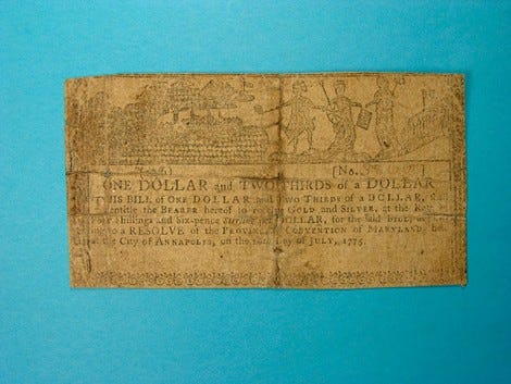 On July 25, 1775, the state of Maryland issued currency depicting George III trampling Magna Carta. The rapidly escalating political crisis between the American colonies and Great Britain, along with the growing need for the colonies to finance military resistance, maintain internal commerce, and operate with some economic autonomy grom Britain, let the colonies to print paper currency. This was driven in part by the scarcity of specie (gold and silver coins) and the inability colonies to impose taxes.