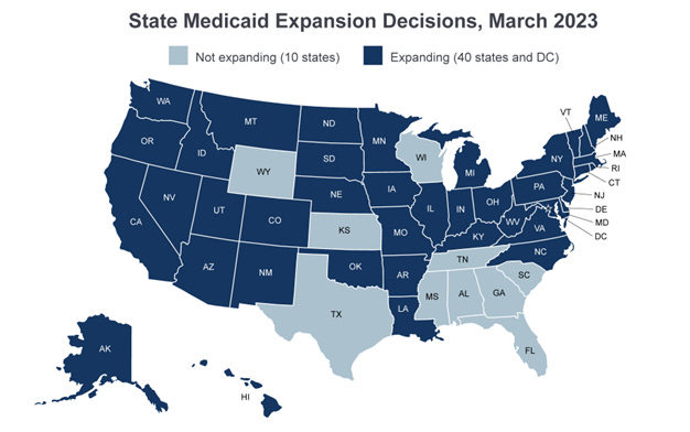 One of the most essential things the ACA did was change the perception of Medicaid from ‘emergency charity care’ to ‘first-line health insurance.’ Prior to the ACA, Medicaid was limited to narrow categories – people who were poor and disabled, pregnant women, or parents. As a result, millions of low-income adults had no access at all. Because Medicaid is a block-grant program (federal revenue is distributed as a block of funding to the states, which administer it through state mechanisms), taking full advantage of the ACA meant that states had to decide whether to expand Medicaid under the ACA. Here’s a map that shows how many states have expanded Medicaid (as of 2023).
