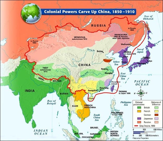 China is the most obvious example. Here’s a map of China showing how it was carved up into spheres of influence at the end of the 19th century.
