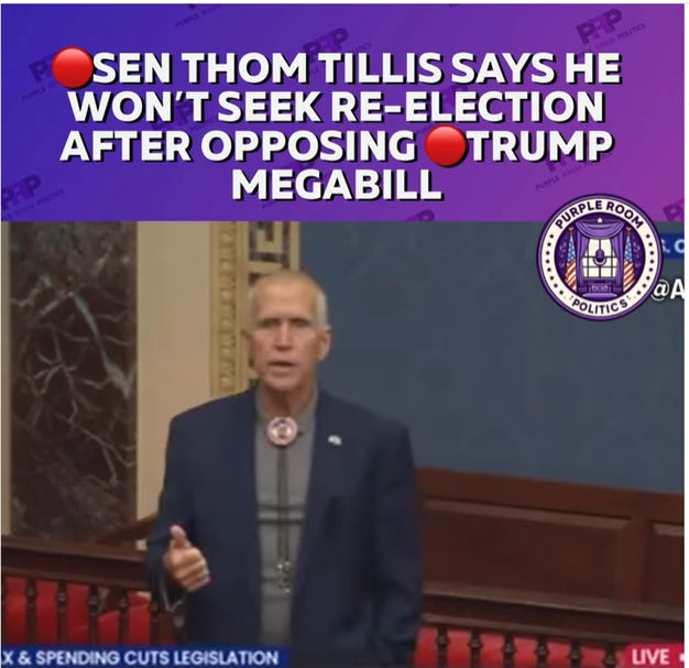 On one important political note, Senator Thom Tillis (R-NC) spoke out scathingly about this bill. Why is this notable? He was one of only two GOP Senators to vote against the bill as it squeaked through the Senate, but after that vote, the current Republican President publicly threatened to primary him in the run-up to the 2026 midterm elections. Tillis then announced that he was not going to run for reelection, and was the only member of the GOP to publicly denounce this bill. The Republic will be saved from the current Republican president only if other GOP Senators (it only takes a couple) follow his lead. There are at least a dozen Senators over the age of 65: Lisa Murkowski (68) and Susan Collins (72), who have been occasional holdouts from GOP support for the MAGA agenda, could take the Tillis route — speak out against the bill, and, when threatened with a primary, tell the current Republican president to take a hike.