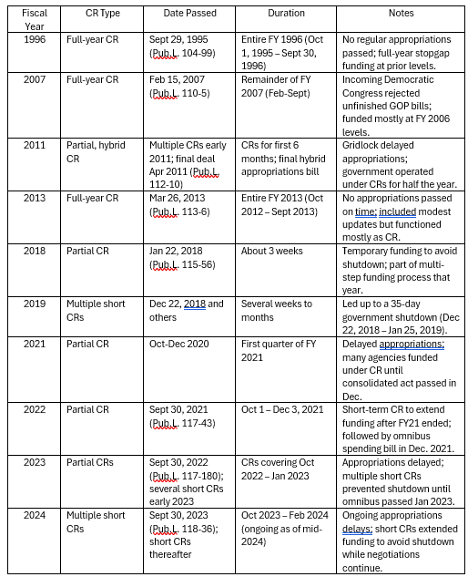In recent years, Congress has not met these deadlines, leading them to be packaged into one large omnibus spending bill or several small minibus bills. When it has proved impossible for Congress to pass these bills by the deadlines, Congress votes on a Continuing Resolution (CR), which temporarily extends funding at current appropriated levels.