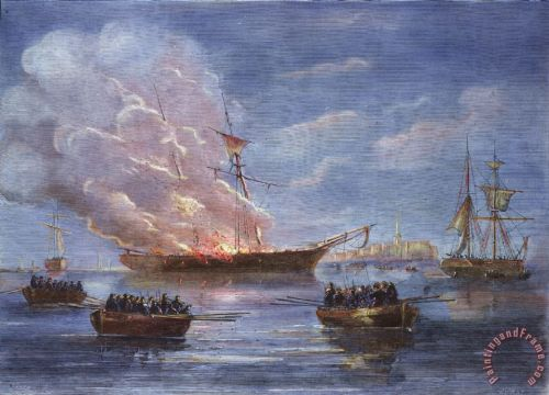 The crew of the Gaspee was unable to free the ship once it had run aground, so Duddingston had to wait for high tide to set the vessel afloat. Before that could happen, a band of Providence men rowed out to the ship, boarded it, wounded Duddingston, forced the crew off the ship, and then burned it to the waterline.