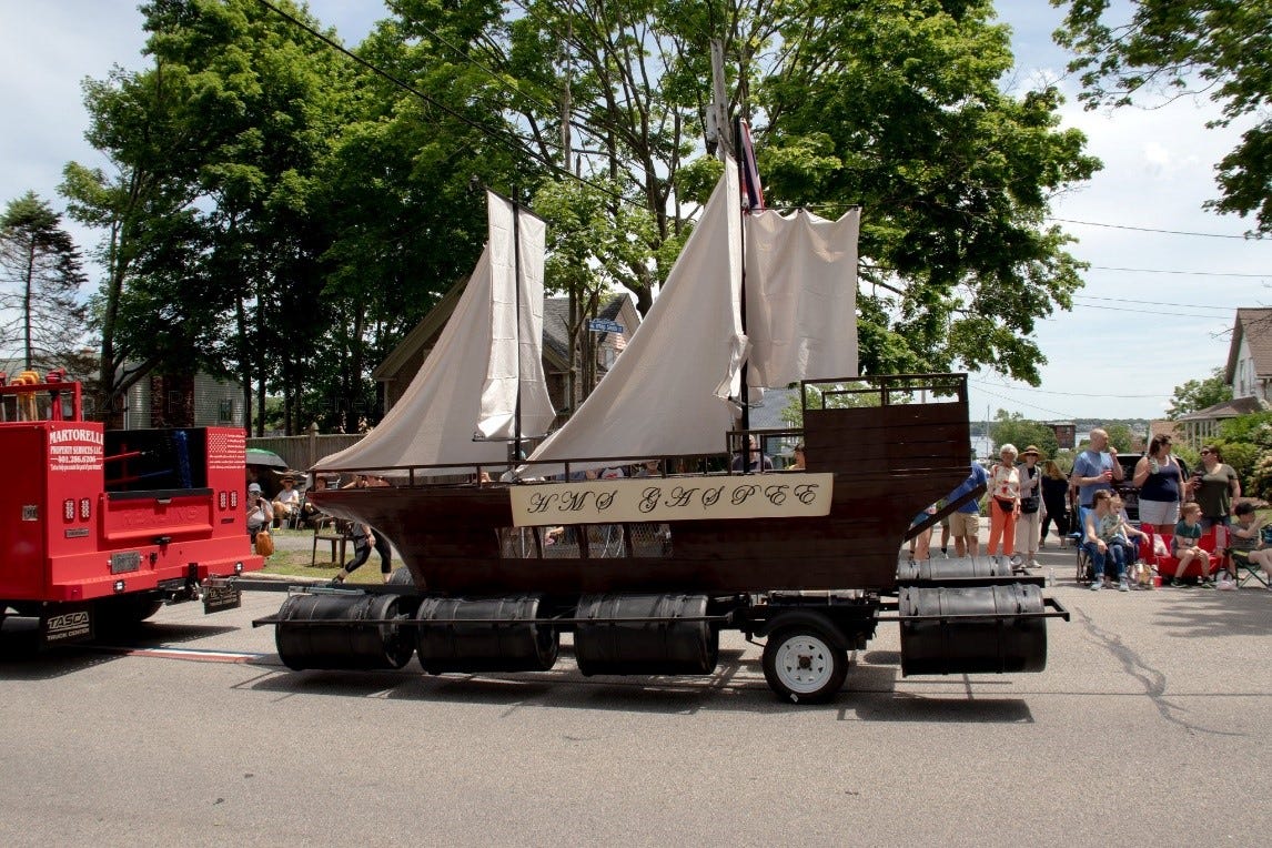 Communities in Rhode Island celebrate Gaspee Day; here’s a picture of a float in the Warwick, RI, 2022 celebration of this holiday. This year, the parade is on Saturday, June 8, at 10:00. It’s less than two hours from Weymouth, MA, for anyone interested in going to the parade. Take pictures.