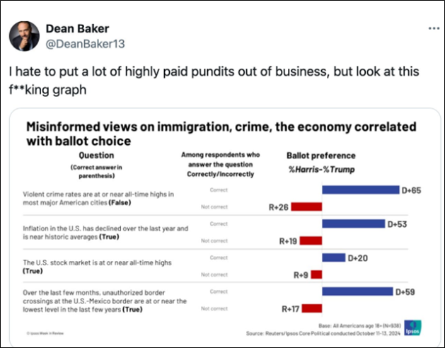 A functional democracy depends upon an informed citizenry. I came across this chart yesterday (on one of the newsletters I read regularly) and it made the point starkly: Trump won because Republicans were misinformed about the issues that said were the most important in this campaign – most importantly, inflation and immigration.