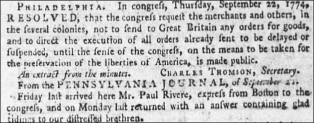 People in Williamsburg learned about these events in the September 29, 1774, issue of the Virginia Gazette, where this block appears on Page 3 as part of a longer story.