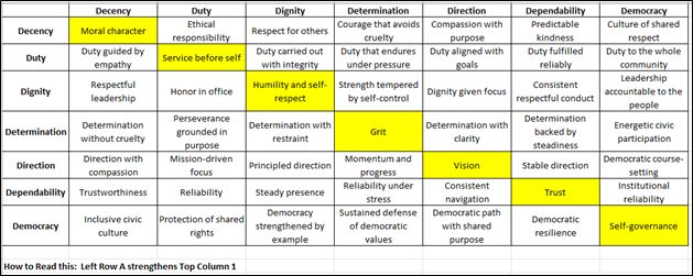The yellow diagonal marching through the matrix is where the virtue intersects with itself – revealing the public-facing aspect of that virtue. For example, when a person who possesses the trait of decency does things that are widely perceived as decent, this exhibits strong moral character. When a person who possesses the trait of duty, his/her public action constantly shows a commitment to service above self interest. And so on.