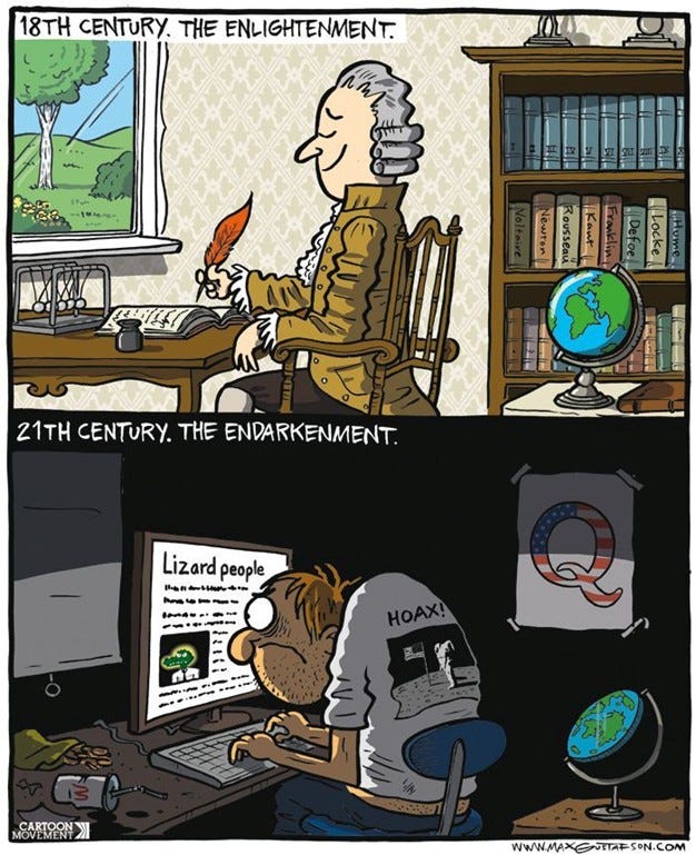 I also found that even my title for this essay – The Endarkenment – of which I was kind of proud – was not original either. Cartoonist Chris Madden reflected on this term in a 2020 political cartoon. You can see what he had to say here.