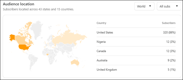 I also have subscribers from other parts of the world. This surprised me a bit. Who’s reading my stuff in Russia or Nigeria?