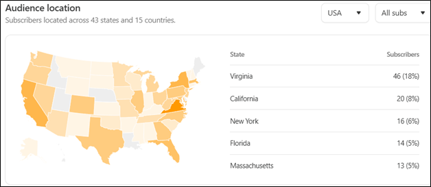 Not surprisingly, the largest number of my subscribers live in Virginia. I was a little surprised that they made up only 18% of my readers, however.