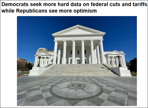 During this year’s General Assembly session, the House of Delegates created an emergency committee tasked with investigating the impact of federal cuts on Virginia. This group met for a third time this week. As you might imagine, Democrats on the committee were more pessimistic about the economic future for Virginians, while the Republicans had a more rosy picture.