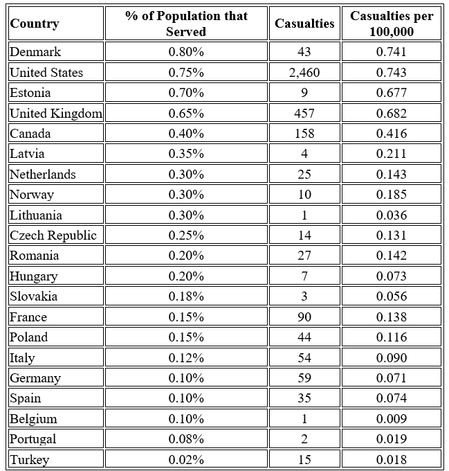 Fourteen member states of the alliance conducted frontline operations in the subsequent war in Afghanistan: the UK, Canada, the Netherlands, Denmark, France, Germany, Italy, Norway, Poland, Turkey, Romania, the Czech Republic, Hungary, and Spain. The intensity and duration of these efforts varied widely.