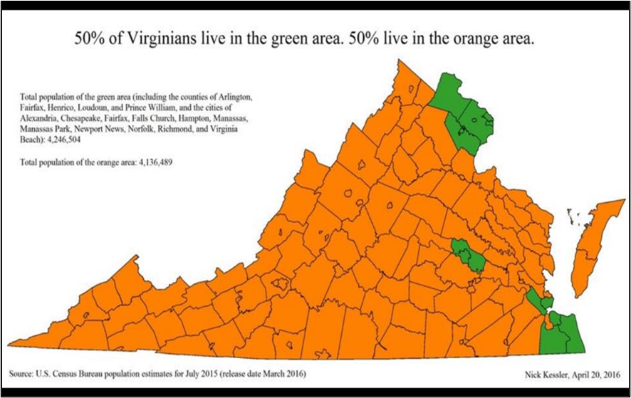 Northern Virginia and Hampton Roads are two of the three most populated areas of the state, as this map shows. It’s going to be interesting to watch MAGA try to “drain the swamp” while needing votes from the very people he is denigrating.