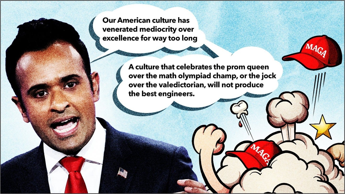 The projected falling-out is happening sooner than I predicted. The relationship between Trump and his wealthiest and most visible supporter – Elon Musk – is rapidly going South. Meanwhile, Ramaswamy is publicly professing his belief that America needs immigrants – specifically, brown immigrants from India – because Americans are simply too stupid and lazy to succeed in today’s technocratic world. MAGA voters are more than a bit flummoxed by this; they were led to believe that ALL brown immigrants were the bad guys, and now they’re being asked to condemn the brown immigrants who come from Latin America while accepting the brown immigrants who come from the Indian subcontinent.