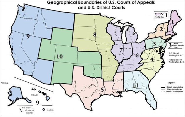 The next step shows you the 13 Courts of Appeal – the 12 geographically-determined courts and the one U.S. Court of Appeals for the Federal Circuit. This latter court will hear the appeal of last night’s ruling from the current Republican administration.